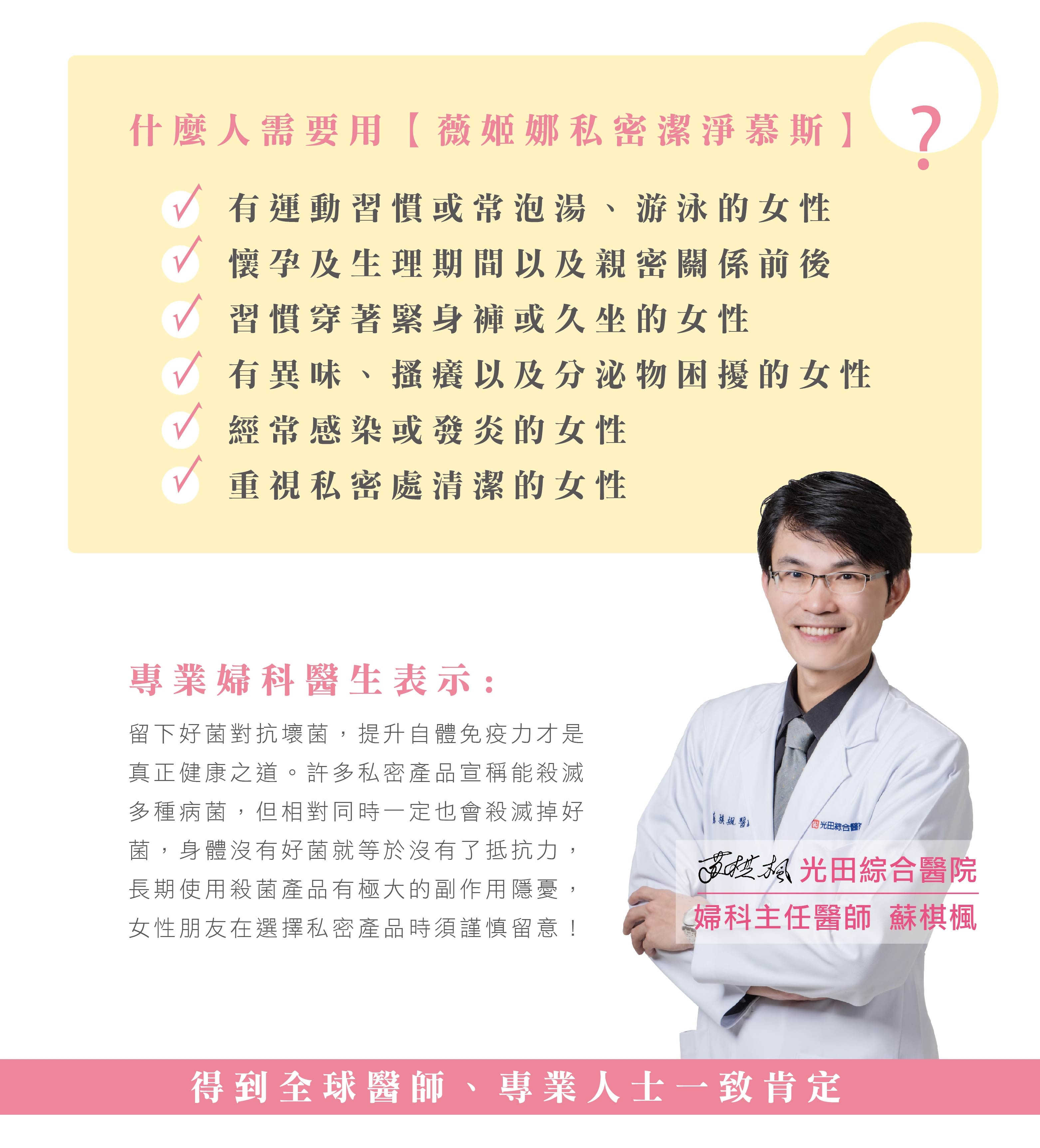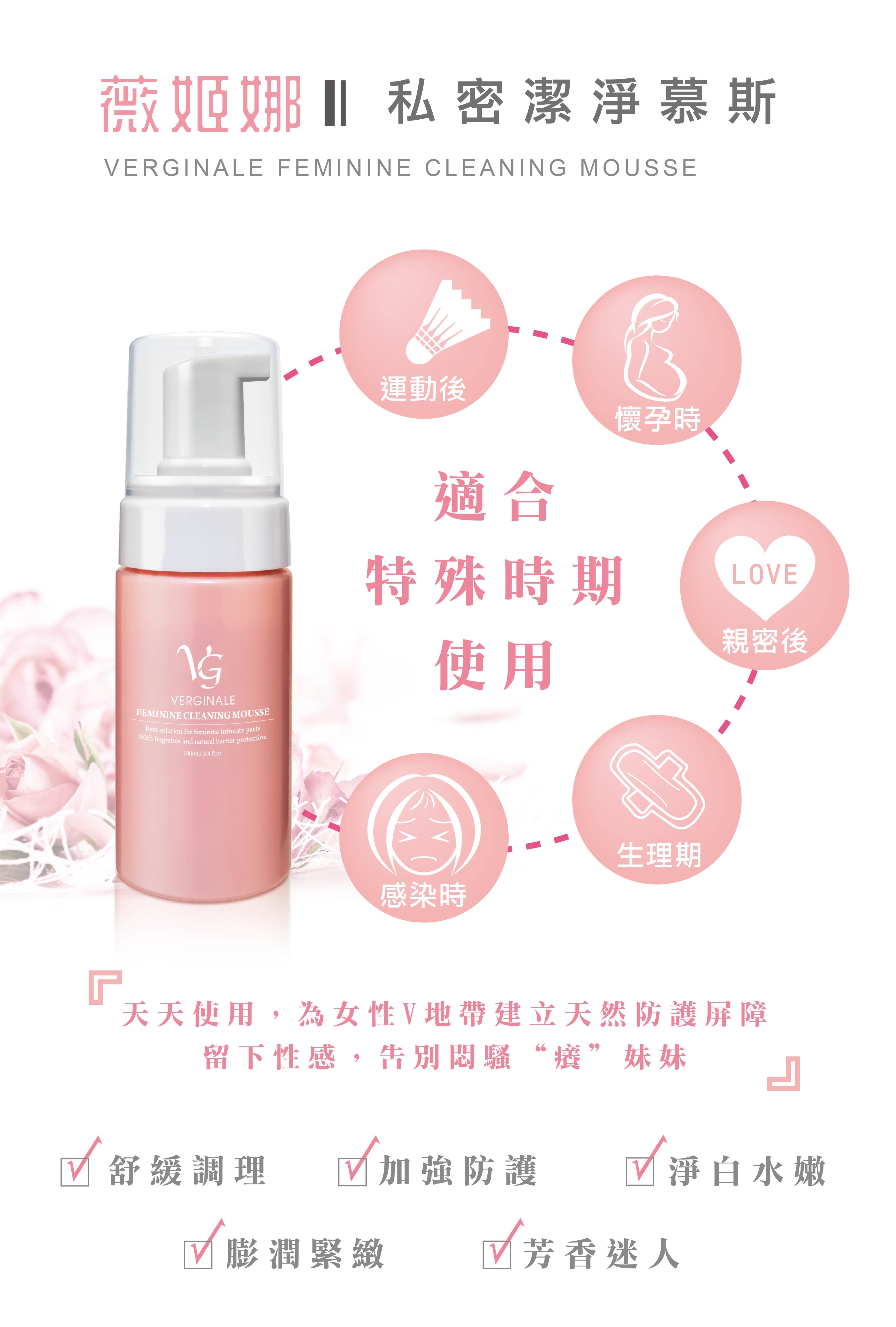 薇姬娜潔淨慕斯薇去除皂、藥、人工化妝品以及容易過敏的表面藥劑作用,通過低敏測試,適合一般女性天天使用。